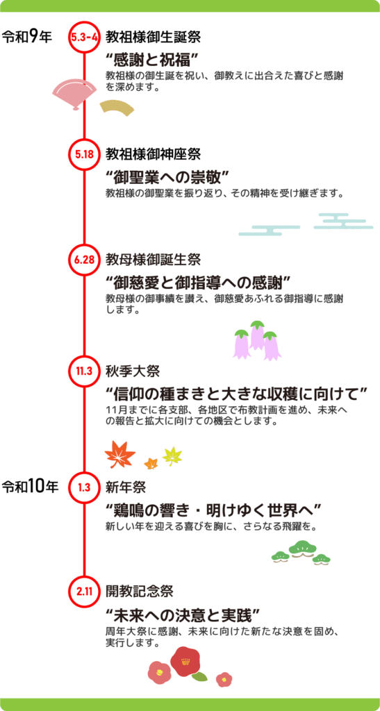 「開教80周年」は令和9年教祖様御生誕祭よりスタートし、令和10年開教記念祭をフィナーレとします。実行委員会では、それぞれの大祭・行事においてコンセプトとテーマを策定し、鋭意取り組んでいきます。